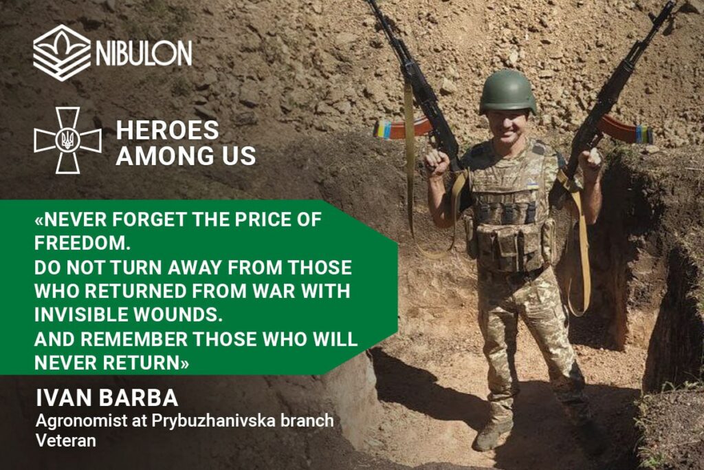 «Do not forget the price of freedom. Do not turn away from those who returned from war with invisible wounds. And remember those who will never return. We live because someone gave their life for this», – Ivan Barba, Agronomist at Prybuzhanivska branch, Veteran